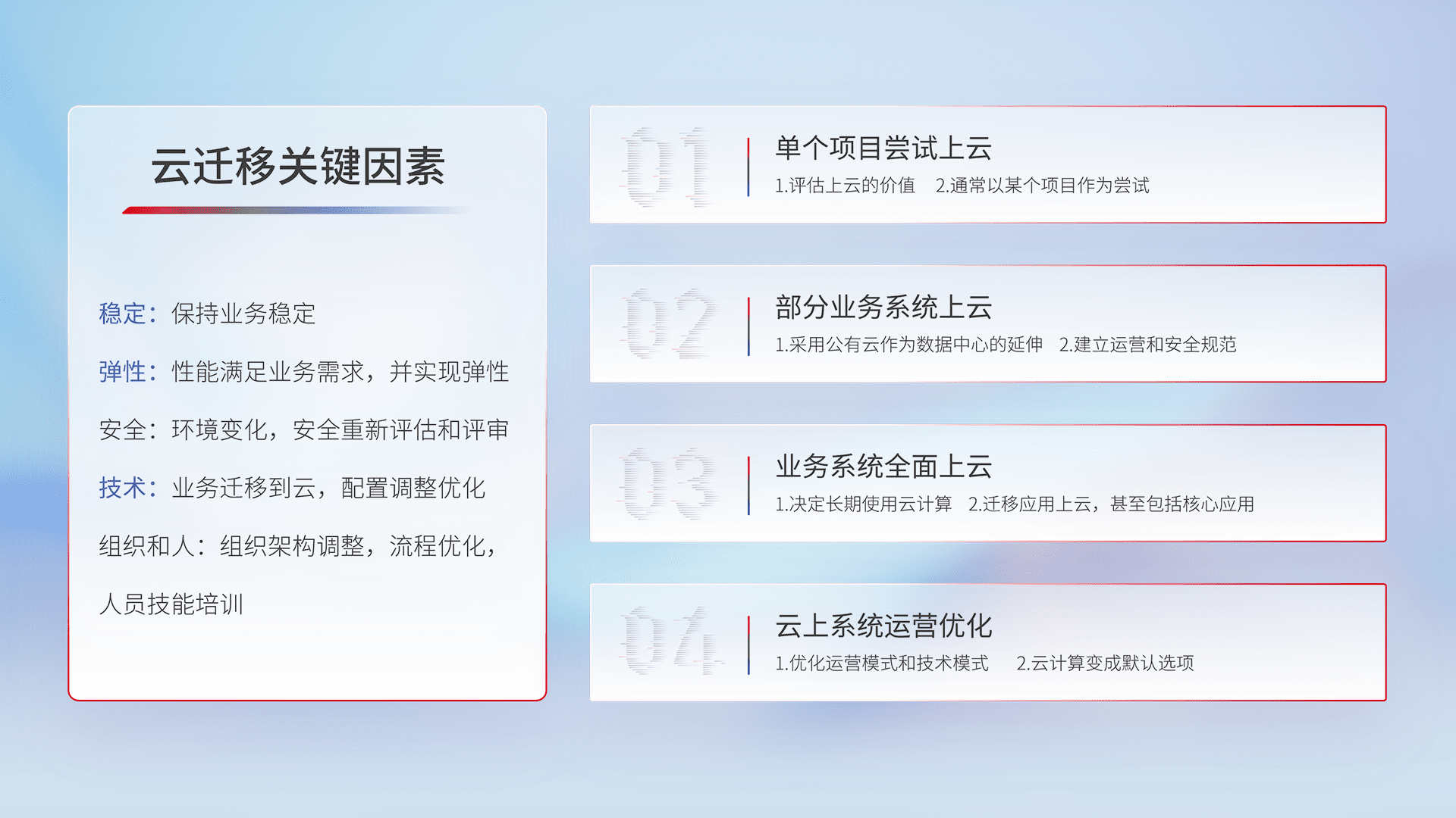结合实际业务,,,,从规划设计、、云平台选型、、、云原生改造、、数据迁移、、集成交付,,,,迁移全过程为客户识别最佳上云路径,,,,做好风险识别管理,,,设计网络架构、、、身份权限、、安全审计合规、、操作审计、、日志审计、、监控告警策略、、多站点容灾设计等,,,对云上基础设施进行整体规划,,提升IT治理水平,,以满足弹性、、、、高可用、、、、高性能的需求。。。。