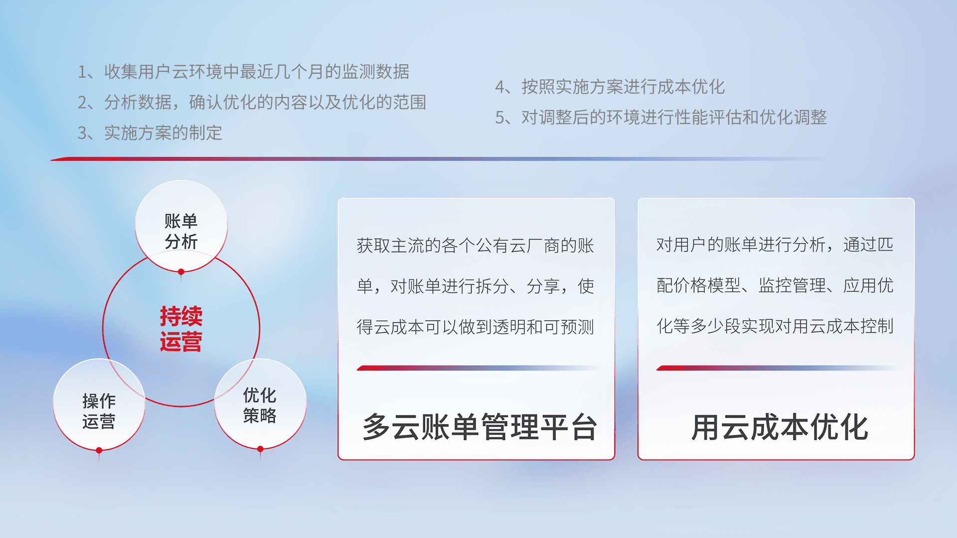 通过多云纳管,,以统一的资源数据模型把客户的云资源进行抽象和封装,,,,进而实现对多云资源的统一操作,,保障云资源管理的可靠性、、稳定性与可用性。。。量身定制化运维内容,,,配置、、、、开发运维、、、、补丁管理、、、、备份、、、监控、、、、认证和访问管理、、、、审计和日常巡检等,,,,保障在用云过程中的可靠度,,,,稳定度以及高可用率。。。。
